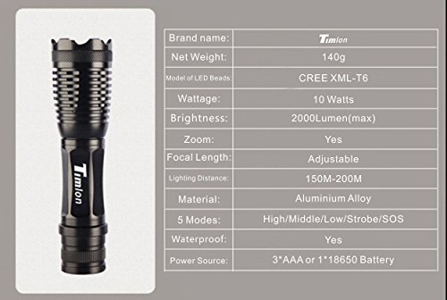 - Super bright CREE XML T6 LED , Adjustable focus with 5 modes: (High, Medium, Low, Strobe, SOS/Emergency);High quality of 50,000 hours working life;