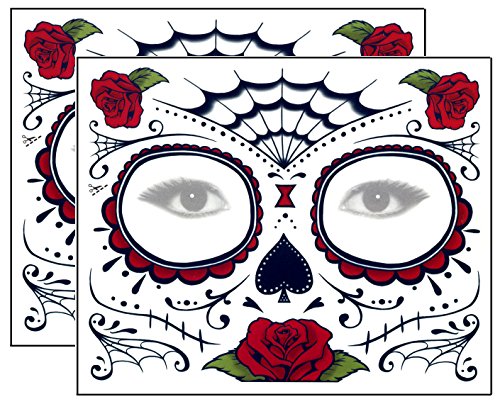 Dramatic Day of the Dead full face temporary tattoo kit features highly detailed red roses and black webs. The kit includes 21 individual tattoo components for precise and creative placement on the face: 8 mirror image designs for each side of the face and 5 center designs. Use any extra tattoos for your chest, shoulders or hands. Safe, easy to apply and easy to remove. Made in the U.S.A. You receive 2 complete face kits.Feature