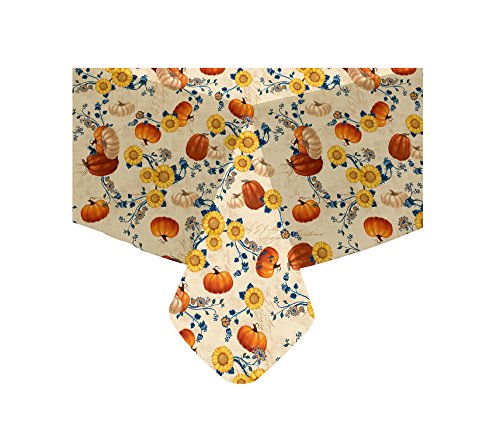 Complement your fall decor with the Fall into Color Tablecloth. Visually delightful, this tablecloth features a lovely pattern of pumpkins and sunflowers on a light background. Easy clean, just wipe with a damp cloth. Flannel backed.
