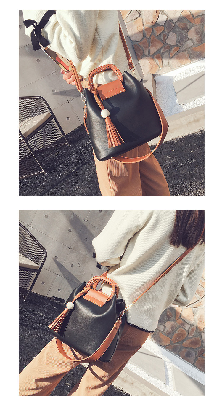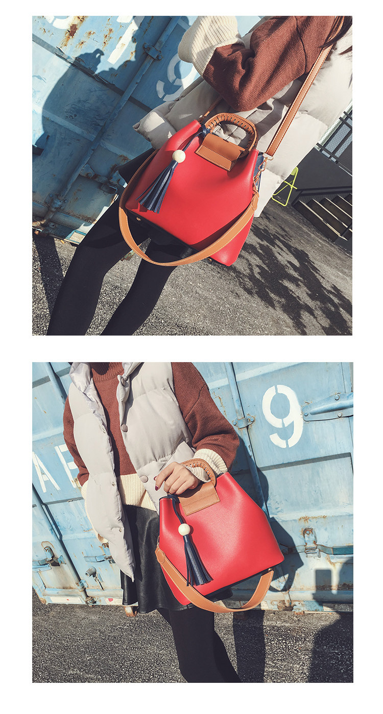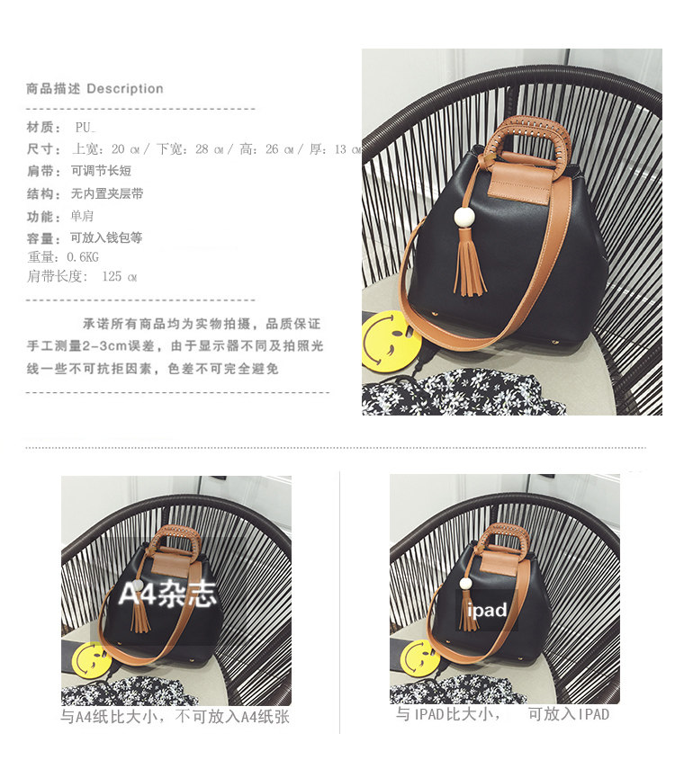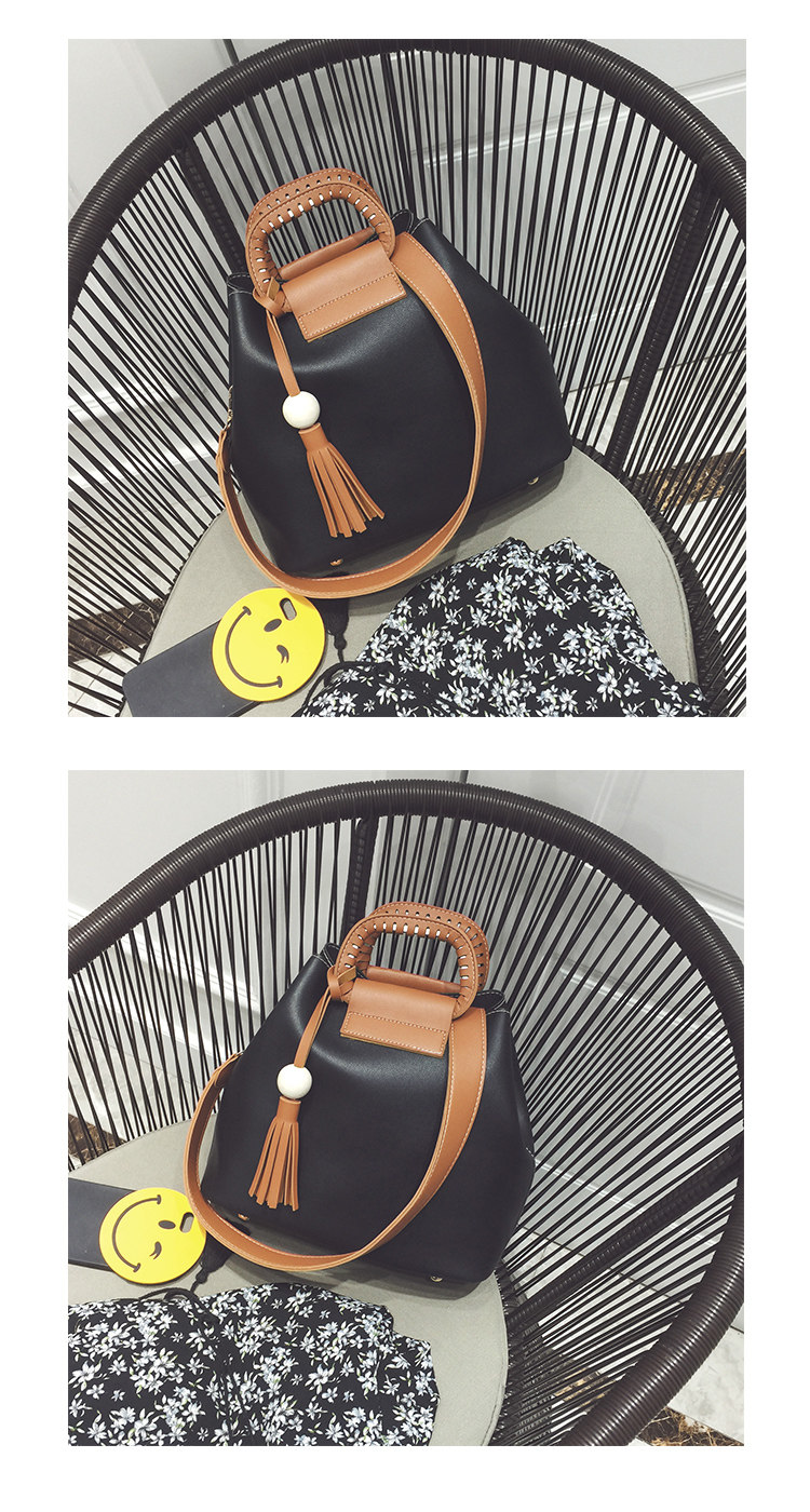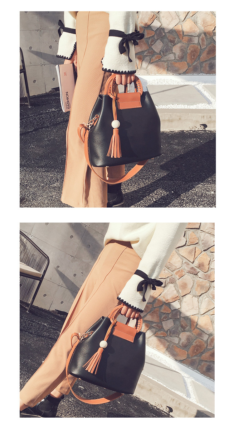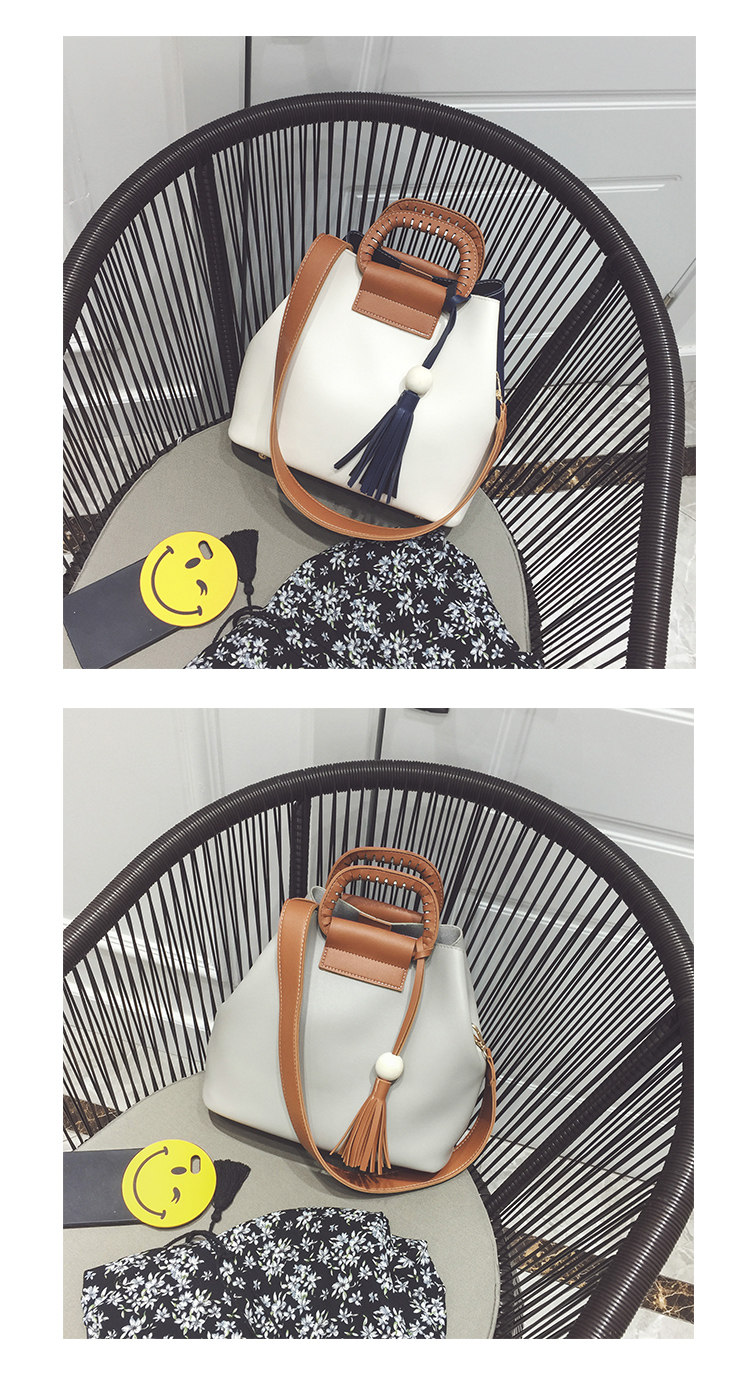 新款女包拼色水桶包流苏软皮大包手提包木珠包斜跨单肩包