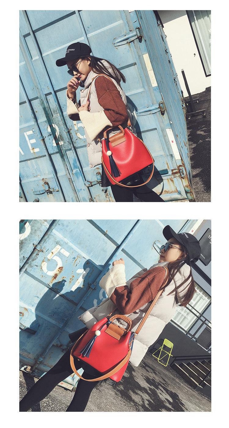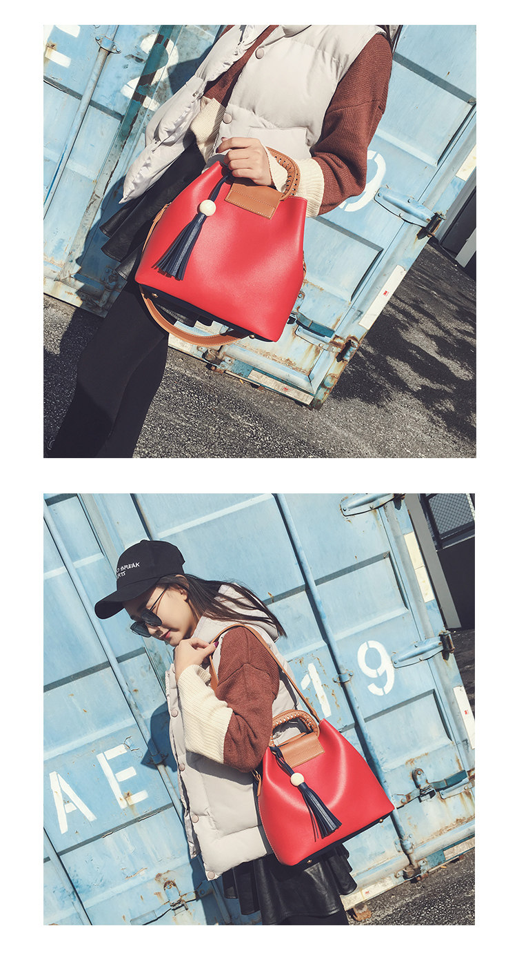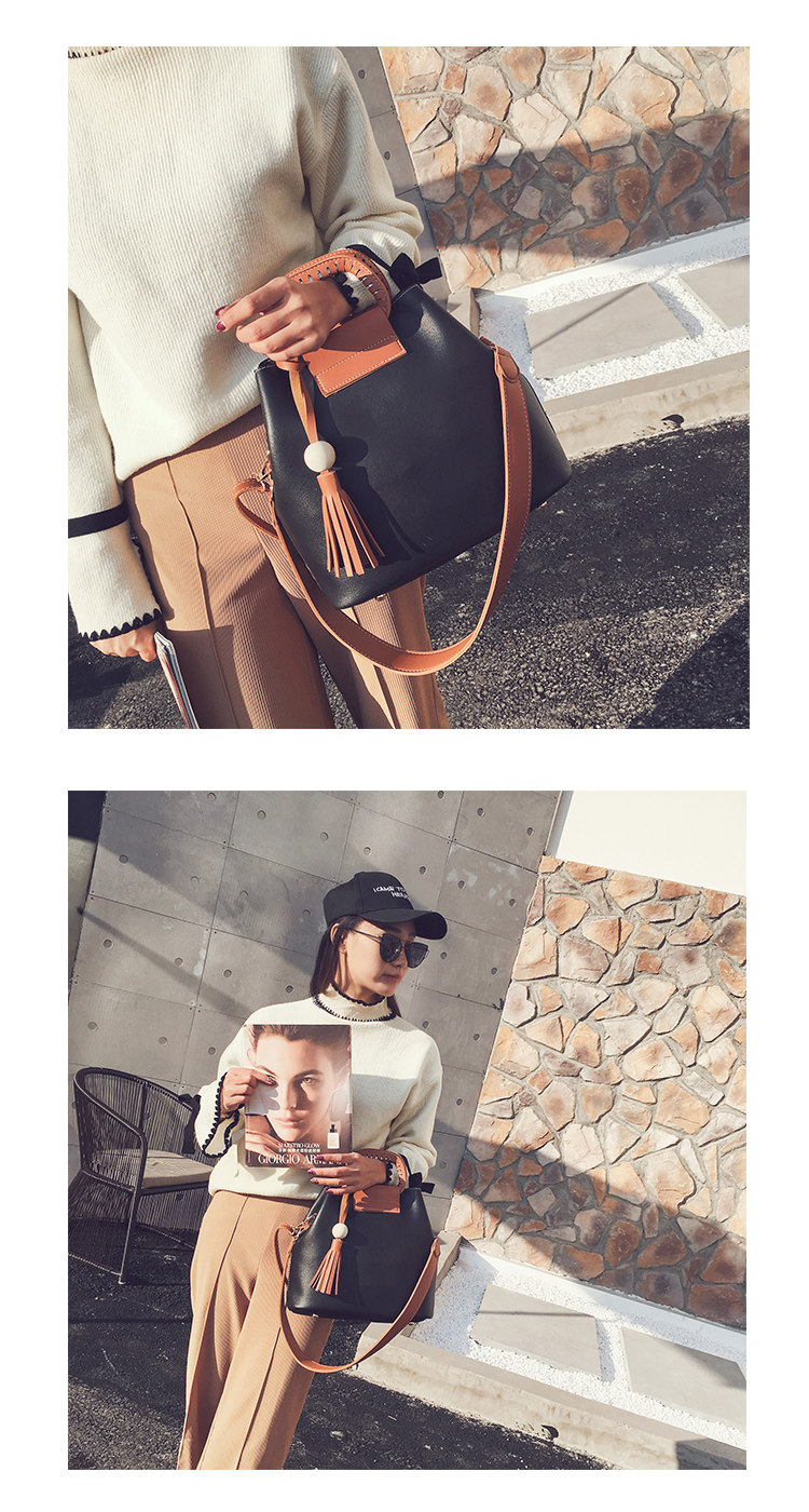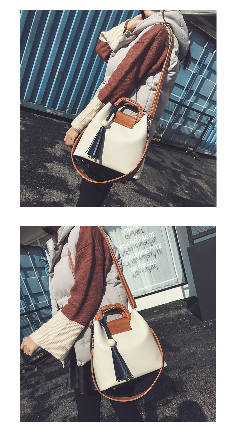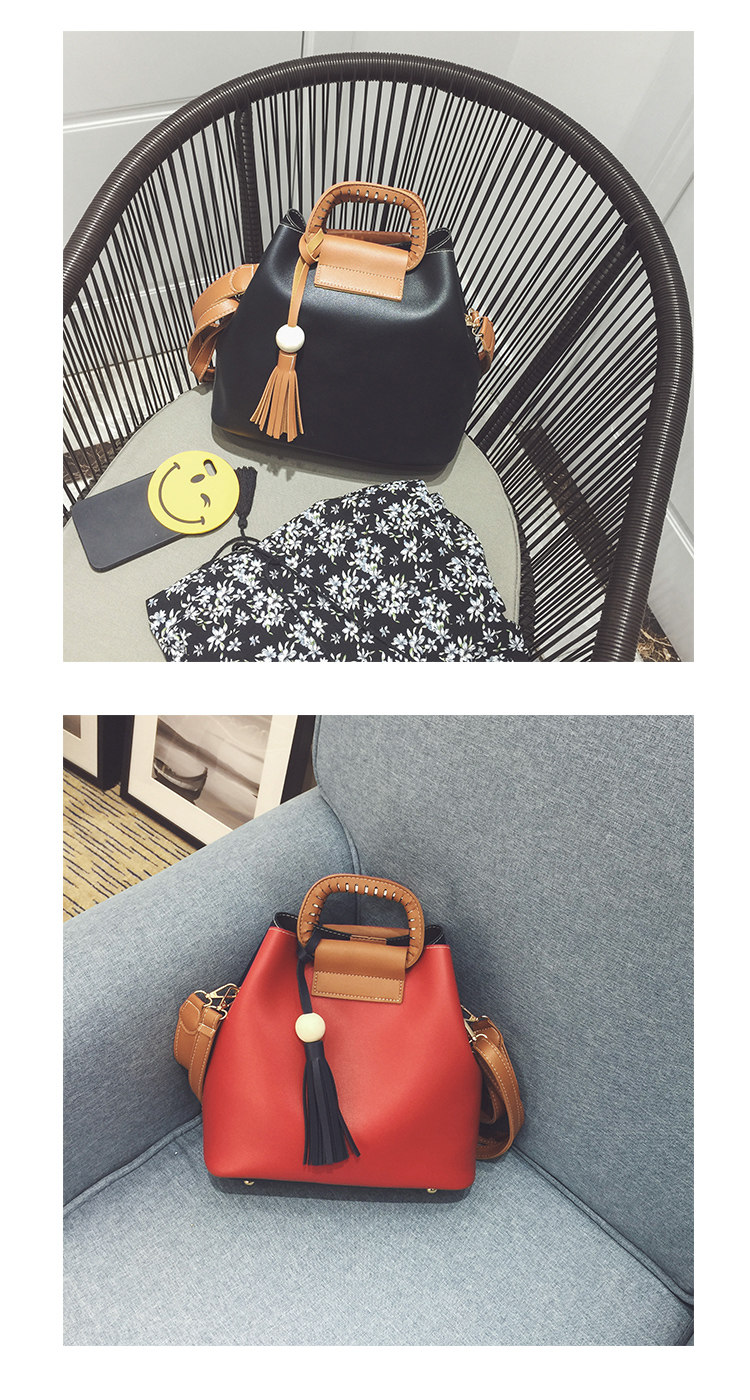 新款女包拼色水桶包流苏软皮大包手提包木珠包斜跨单肩包