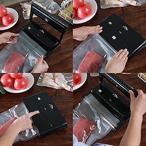 袋に食材を入れ蓋を開けて、ロールのとじ口を真ん中に合わせ、蓋を閉めて、それから手で蓋の両端をずっと長押します、表示灯が燦いてから手を放し蓋を開けて真空完了です。