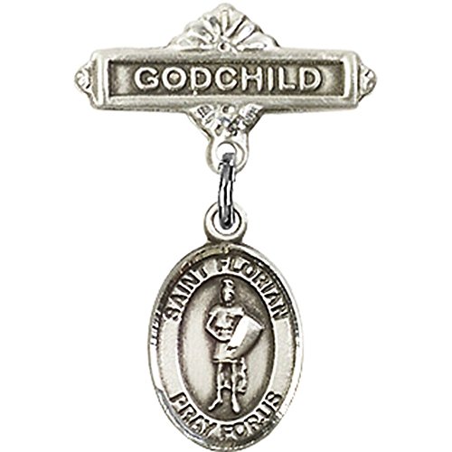 -. Title : Sterling Silver Baby Badge with St. Florian Charm and Godchild Badge Pin 1 X 5/8 inches
