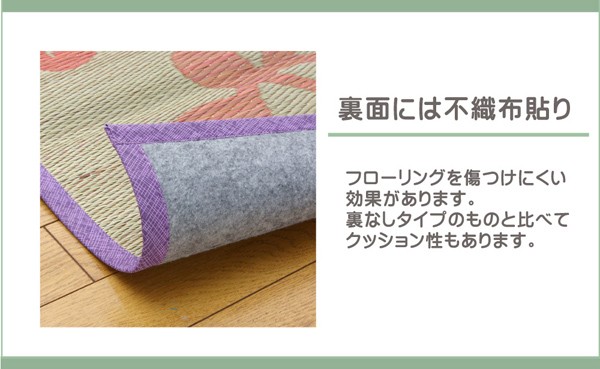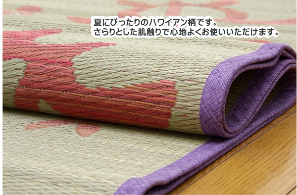 夏らしいリゾートテイストのい草ラグです。い草には空気の自然浄化作用、湿度の調節作用などがあります。また汚れにくく、使用するうちに黄金色に変化し味が出ます。い草に青森ヒバ加工を施しています。(抗菌、防臭効果)フローリングを傷つけにくいよう、裏には不織布を貼っています。