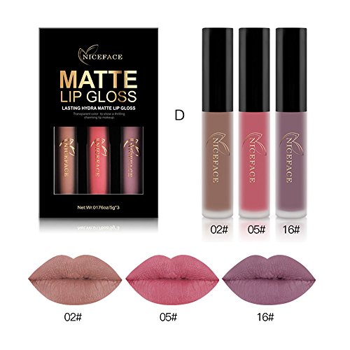 -. Feature : It's Waterproof, Non-stick on Cup, this lasting hydra matte lip gloss is best for every occasion. / Features: Charming Matte Effect, Long Lasting Maintain, easy to create charming lips. / 3 different beautiful colors, color is pump, and it's colorfast. 3 colors are as picture shows; just choose the best set for you or those you love! / With perfect package, it's ready for as a Birthday gift to friends or families. Perfect for various occasions, such as dating, party, wedding, bar, ball, camping, office, school, or daily makeups. / Package included: 1 Set x 3pcs Long Lasting Matte Lipstick.