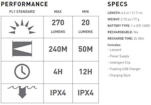 PERFORMANCE SPECS: max 270 lumens (min 20), max distance 240M (min 50M), max battery life 4H (min 12H), Water resistance rating IPX4.