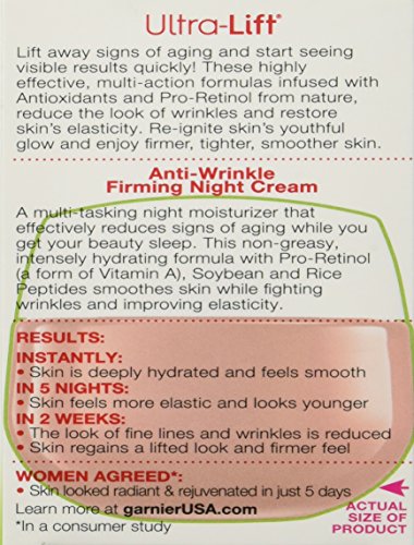 Studio : Garnier Skin Publisher : Garnier Skin Binding : Health and Beauty Product Description Ultra-lift introduces pro-retinol from nature, a blend of natural linoleic acid from the safflower and retinyl acetate. It is developed through the environmentally-conscious process of green chemistry, that is free of solvents and minimizes energy consumption and waste. Ultra-lift effectively targets and visibly lifts wrinkles with retinol-like action, all while gentle to your skin.garnier nutritioniste(r) ultra-lift(r) anti-wrinkle firming night cream is dermatologist tested for safety, including sensitive skin; non comedogenic - won't clog pores; gentle to skin; allergy tested; non-greasy. With pro-retinol from nature, this daily anti-wrinkle cream continuously delivers a clinically effective wrinkle repair action to the core of each wrinkle. It intensely restores firmness without harsh side effects. Retinol is an effective way to fight wrinkles, but can be harsh on skin. With pro-retinol from nature, ultra-lift anti-wrinkle firming night cream delivers a powerful wrinkle repair and firming action while you sleep, with virtually no irritation or dryness. Over time, skin loses its ability to retain essential nutrients, collagen begins to break down, wrinkles and loss of firmness occur. Ultra-lift anti-wrinkle firming night cream combines pro-retinol from nature with other skin-essential nutrients to intensely restore firmness and boost nightly wrinkle repair."skin-nutrient" facts - ultra-lift with pro-retinol from nature lifts wrinkles effectively from the core; rice protein fortifies skin's structure; argan extract firms skin. Results - instantly skin is visibly smoothed and deeply hydrated. In 4 weeks wrinkles are reduced and natural firmness is restored; with continued use wrinkles are lifted, skin is firmer, and a more youthful look is restored. In a clinical test on wrinkles, formula proved effective. Skin's upper layers.ingredient complexes developed exclusively by garnier to work on skin's outer layer. 0