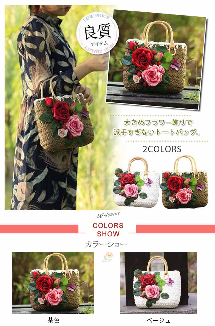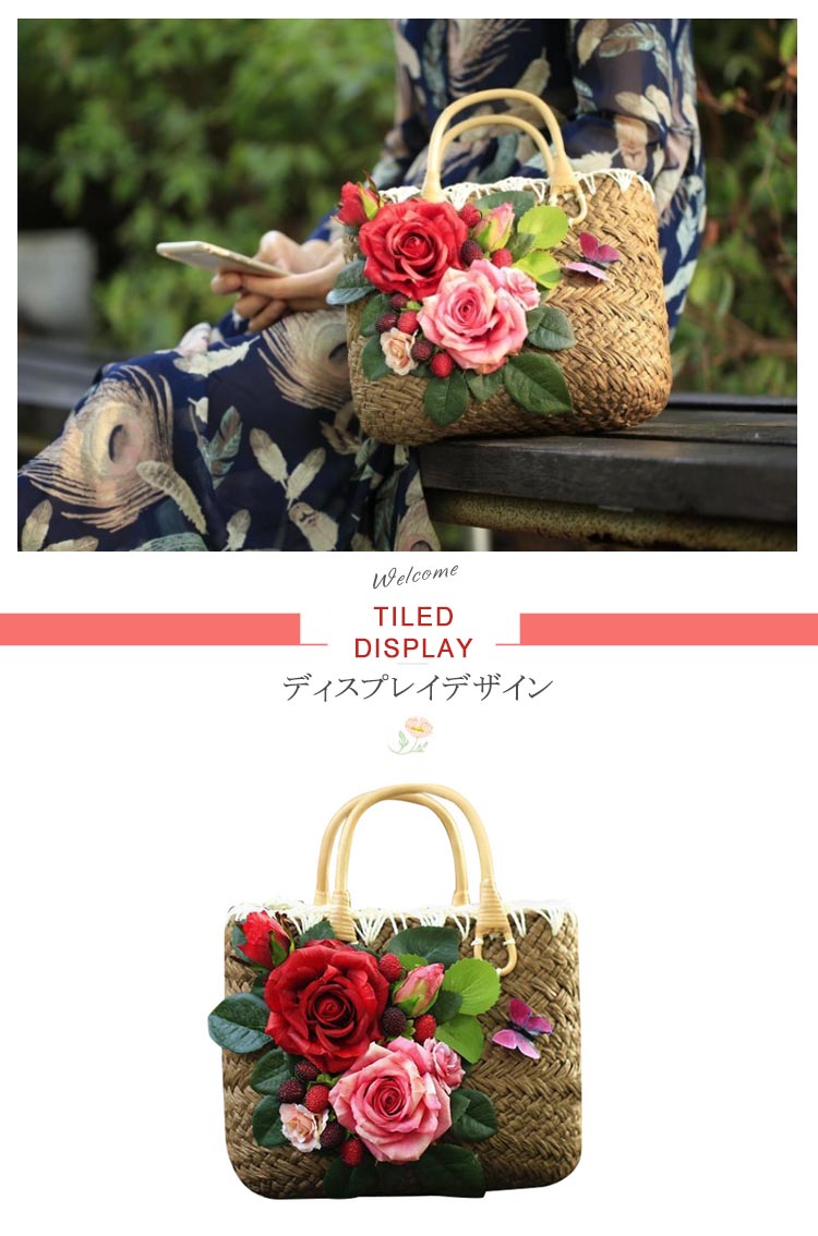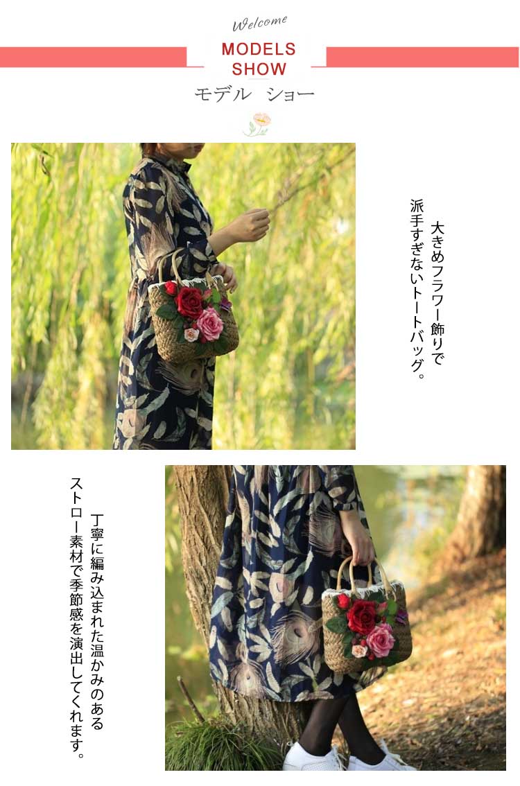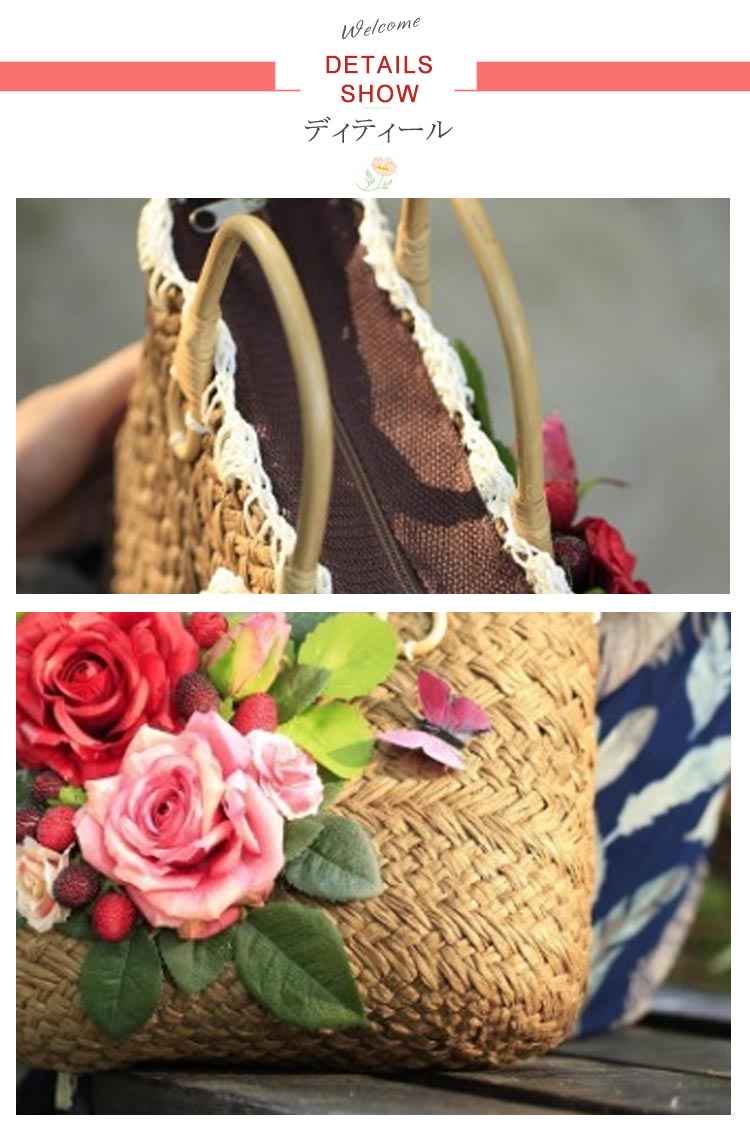 | 大きめフラワー飾りで派手すぎないトートバッグ。丁寧に編み込まれた温かみのあるストロー素材で季節感を演出してくれます。開閉はファスナー式で中身が見える心配がなく、セキュリティ面も安心ですね。リゾート感を残しつつ、大人っぽくまとまるのが嬉しい一品。 | |