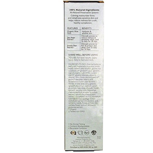 -. Feature : This bundle includes two units of 1.7 fl oz (50 ml) Aubrey Organics Calming Skin Therapy Moisturizer. / Calming moisturizer firms and rehydrates sensitive skin and helps reduce redness for a soft, healthy complexion. / Organic Aloe Vera: Hydrates and soothes skin. Sea Aster Extract*: Clinically proven to reduce redness and sensitivity when used 2x daily for 28 days. / P.R.Ickly Pear Extract*: Clinically proven to firm and protect skin when used 2x daily for 14 days. / This hydrating formula is the perfect blend of world herbal traditions and new science. Certified to NSF/ANSI 305 by QAI. Contents Biodegrable. Vegan. Gluten-Free.