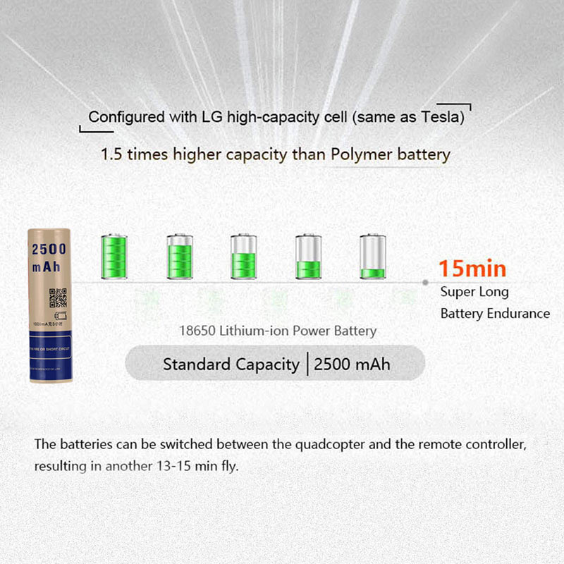 Features: A uniquely designed 2S 2500mAh Li-ion 18650 smart battery sets The quadcopter can fly 13-15min. Additionally, the batteries can be switched between the quadcopter and the remote controller, resulting in another 13-15min fly A modular design makes LY-250 easily build, rebuild, repair, and maintain Its all major parts are plug-in assembled to allow easy upgrade and add more modules Each part of LY-250 has been well designed and tested for the lowest weight, the longest endurance, and the best performance Its propellers are small but 100% balanced tests ensure that they hardly break themselves A 7-channel LY-I6 transmitter assures the 1024 class sensitive control under three flight modes: Self-stabilization Mode, 3D Flight Mode, and Full Manual Mode Under Self-stabilization mode and trainer mode, the quadcopter can be started by an amateur The 5.8G real-time image transmission system can bring you the unforgettable visual enjoyment Brushless 2300kv motor enables LY-250 to fly more agile and faster, with multiple mode of unlimited enjoyment Exteme speed with tactile control, ultra fast speed of 110km/h. Equipped with 420TVL camera