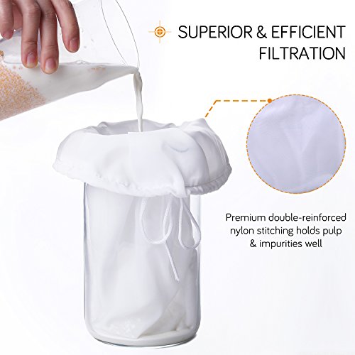 - Superior & Efficient Filtration: The nut milk bag adopts premium double-reinforced nylon stitching craft that holds up pulp and impurities very well. Its tightly woven mesh allows good filtering and smooth passage of liquid.