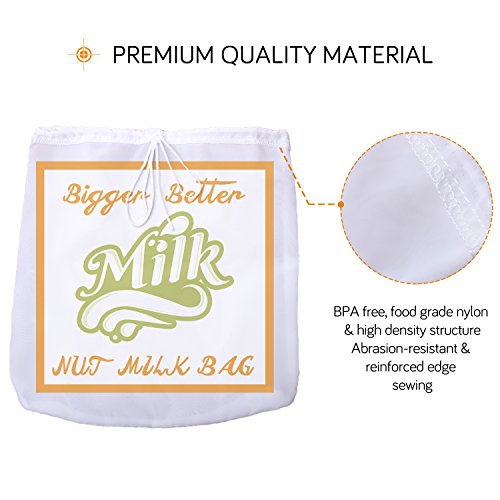 - Optimum size: The 12"x12" nut milk bag fits most strainers, filters and containers. It comes with a large opening and superior nylon drawstring design that allows fast drying and is mold free. The milk bag easily squeezes out milk and prevents mess from overflowing.