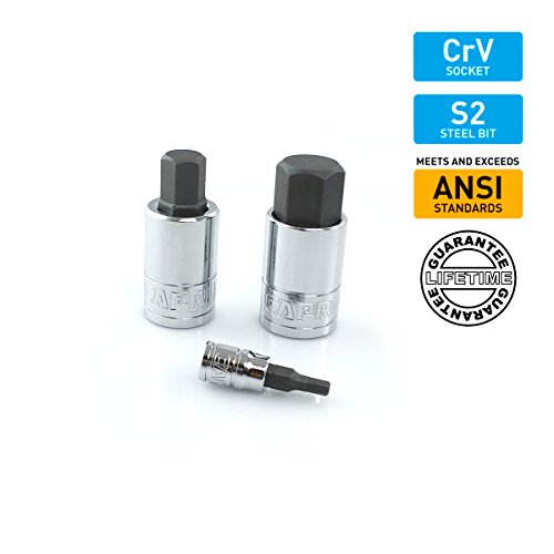 - Feature : Work on cars, trucks, appliances, lawn equipment, machinery, and other jobs requiring Hex fasteners/bolts / These bits are made of drop-forged, heat-treated S2 steel for premium quality and durability / Chrome plated Chrome Vanadium sockets provide maximum oil and corrosion resistance / Designed for breaker bars, torque wrenches and ratchets / Meets and exceeds ANSI standards and comes with a lifetime replacement guarantee