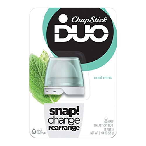 ChapStick DUO is the first lip balm from the makers of ChapStick balm that can be totally customized. With 12 fun flavors and up to 28 combinations, you can express every side of you! Simply choose your favorites and Mix, Match and Attach to make your own custom flavor combos. Talk about versatile! You can wear each flavor alone, or smooth one on your top lip and another on your bottom lip, and tada! You’ve created a whole new flavor sensation. But there’s even more to love about ChapStick DUO. It gives your lips up to 8 hours of moisturizing care, keeping them soft, smooth and healthier looking. With so many irresistible varieties and fun, flavorful match-ups, you’ll want to collect them all! ChapStick – Skincare for Lips. ChapStick DUO (Cool Mint Flavor, 1 Blister Pack of 1 Piece) Half Lip Balm, 8 Hour Moisture, 0.194 Ounce NET WT 0.194 OZ (5.5g)Feature