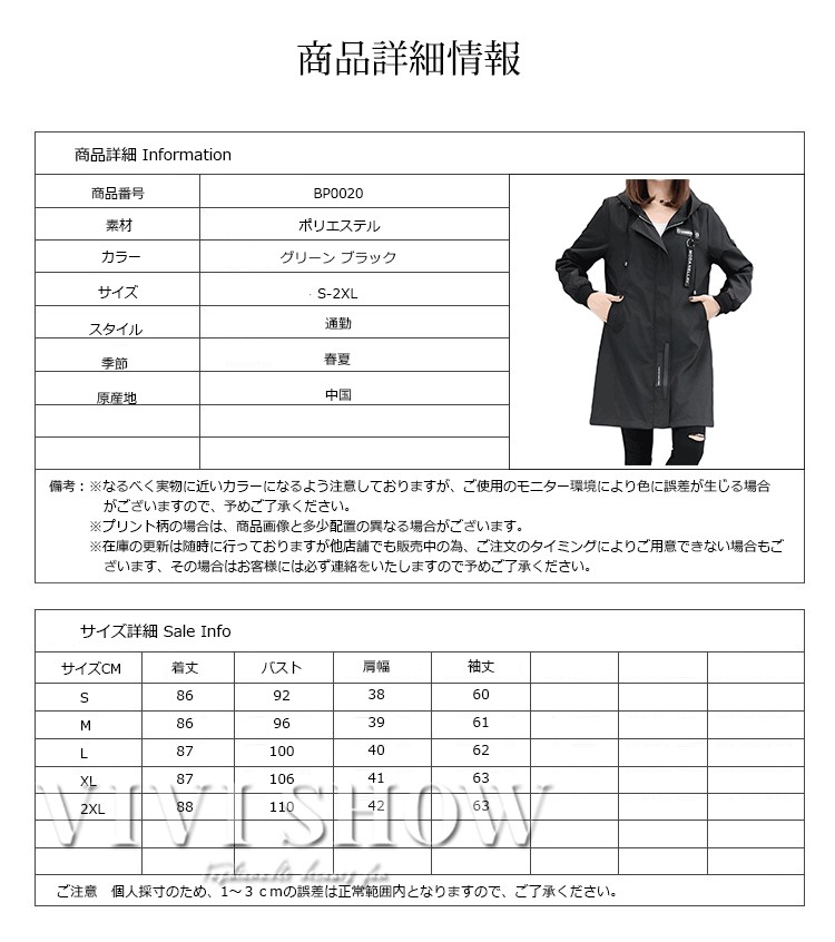 ■素材:ポリエステル■カラー:グリーン ブラック■サイズ:Sバスト92着丈86肩幅38袖丈60Mバスト96着丈86肩幅39袖丈61Lバスト100着丈87肩幅40袖丈62XLバスト106着丈87肩幅41袖丈632XLバスト110着丈88肩幅42袖丈63■原産地:中国