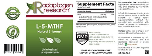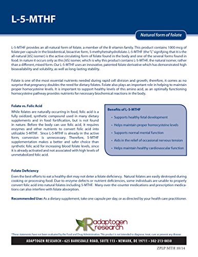 -. Feature : L-5-MTHF provides the all-natural form of folate. Folate is essential for cell division and growth, and also works to balance the homocysteine pathway / 1000 mcg per capsule of folate in the bioidentical, bioactive form, 5-methyltetrahydrofolate. / Natural isomer / 120 Vegetarian Capsules / Made with non-GMO ingredients