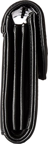 Lined interior features a zipper pocket, three slip pockets, and five credit card slots.