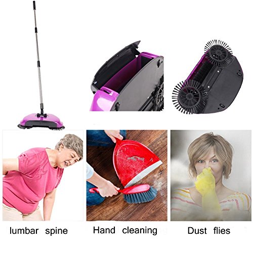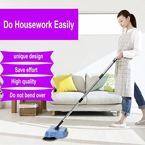 Studio : BingHang Publisher : BingHang Binding : Kitchen Product Description Product Name:Hard Floor spinning broom Material: ABS pro-environment resin Size: Total length 130cm Package Inclued: 1 sweeper broom 1 broom holder Features: Will you feel tiredwhen using it? Definitely not. ABS resin handle isergonomic design with comfortable hand feeling, stainless steel telescopic tubein different derectiongs freely adjusted to best suit their length. Does this spinning broom need electricity? How to work? Does it easy to install? This broom adopt the latest advancedtechnique, No Electricity, No batteries. Push it forward ,it can automaticallycollect the trash into the garbage bin. Easily to use and easy to install . What kind of groundfit for this sweeper?. This broom is fir for the hardened ground(wood floor, tile floor, marbled floor). Don't use it to sweep the stairs anduneven ground (Carpets, Foam Pad). Can the sweeper broom sweep all the places? Does it have dead corner? Yes, it has a dead corner, the broom canclean 98% places except for the narrow places which need to. Every cleaner hasits dead corner. Can this sweeper broom all kinds of garbage? This broom is designed for the family.Mainly aimed for the hair, peanut shell, melon seeds shell, scraps of paper,rice, granular garbage. All of these can be cleaned up. And this is not avacuum cleaner, so it cannot sweep the the tiny dust. NOTE: Using hairdrier blow and warm bent hairbrush straight with distance It cannot use on the carpet Please dismantle and clean all brush rollers if the brush can not turn