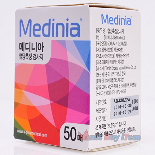 -. Feature : Medinia Blood Glucose Monitoring System (Korean Ver.) / Medinia Blood Glucose Diabetic-Aid Diabetes Glucometer 100 Test Strip 2 Box Exp 10/2018 / Accurate measurement, Simple control, Quick results in 5 seconds, Memory 300 results / Distribution of outcomes before and after meals and after the move, Big readable display / Package Included : 100 Test Strip (2 Box)