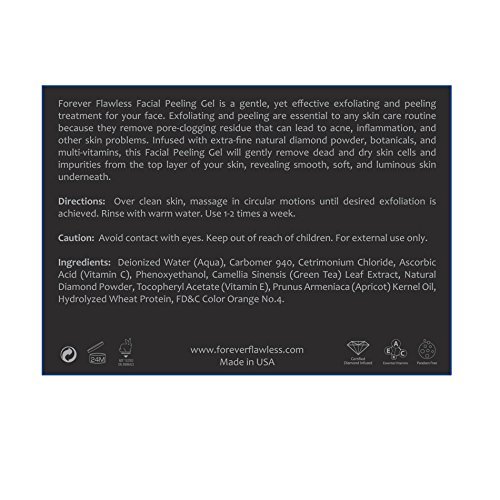Forever Flawless has blended together powerful ingredients that will give you the healthy glow and fresh look you need to look and feel your best Your face takes a beating every day from makeup dirt grime and pollutants that are in the air Scrub off those aging factors with our facial peel and exfoliator to naturally bring back your faces youthful look Formulators at Forever Flawless have combined the perfect formula to rejuvenate your skin with antioxidants like Vitamin E Green Tea Leaf extract and Ginkgo Biloba Leaf extract We know you will see and feel the difference Infused with extra fine white diamond powder to safely remove dirt and dead skin cells while helping the rich blend of ingredients penetrate deeper into the freshly revealed skin for maximum results Using Forever Flawless Facial Peeling and Exfoliating Gel with Natural White Diamond Powder is simple clean your skin and massage the exfoliating cream in circular motions on your face until desired exfoliation is achieved Rinse your face with warm water and you will notice that your face is smooth soft and glowy Many users also say they are able to see the dry dead skin cells come off as they are exfoliating We recommend that you use the facial peel and exfoliator 1-2 times a week for best results Your natural skin can be beautiful with the right kind of care This gentle yet effective exfoliating and peeling treatment is part of our 4-step basic facial regimen to enrich with genuine natural diamond powder to keep your face clean hydrated and radiant All Forever Flawless products are made in the USA to ensure the best ingredients and the highest quality manufacturing standards Our facial peel and exfoliating gel comes with satisfactory guarantee If you do not love this facial system within 30-days we have a money-back refund policyFeature
