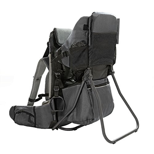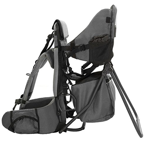 This Grey Clevr Child backpack carrier is made of strong but lightweight metal frame and 600d oxford cloth, it can withstand the elements and daily use. Featuring multiple pockets, thick padded shoulder pads, padded waist strap, and two side water bottle holders. Extra large back pocket for diapers and necessities, which also features a safety reflective strip across the back pocket. Sun/Rain canopy can be easily removed at anytime. The child carrier features an easy adjustment system to provide a comfortable fit for you and your child. Metal stands allow it to sit upright on a flat surface and can be quickly folded in when on the go. Folds flat for easy storage and portability. Ideal for children up to 4 years. Details- Only weighs 5 pounds!