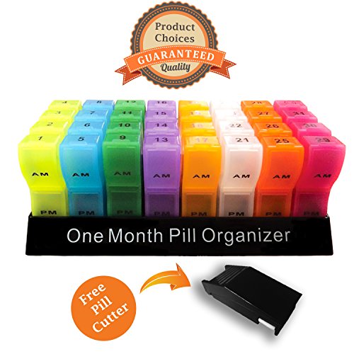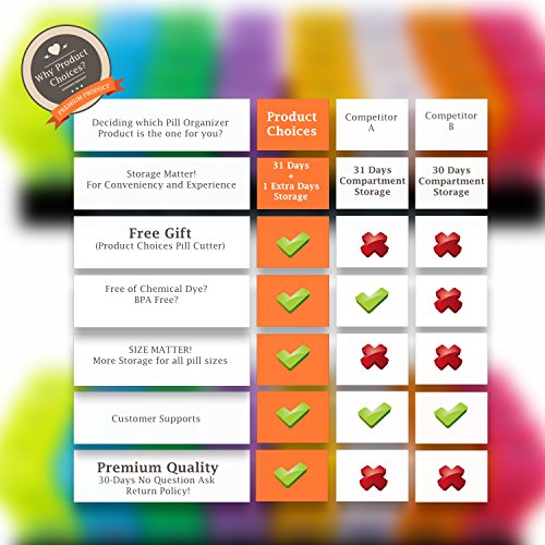 ? 31 Days Slots with AM/PM 1 Extra Slots ? FREE Pill Cutter for your Convenient ? BPA Free Eco-Friendly for the Environment. ? Prefect Gift Guarantee! Keep you Love Ones Healthy and Safe - NEVER FORGET AGAIN. ? 8" x 3" Size to fits all major pills size. . ? The Efficient Design and variant colors system placed in the kitchen/bedroom or dinner table help you to NEVER FORGET to take your Medications again. ? 30-Days No Question Ask Returns Satisfactions Guarantee DESCRIPTIONSProduct Choices One Month Pill Organizer System maintain and track your Medications intake. Each days of the month will have 2 slots - AM PM. Also, each 4 days of the month is a different transparent variant colors so you will NEVER FORGET to take your medications again. Product Choices One Month Pill Organizer 8" by 3" should be more than enough storage for all your majors' pills or vitamins for the Whole month with an EXTRA FREE Pill Cutter if needed. Buy with Confident since Product Choices offer a 30 Days NO QUESTION ASK return police. Don't Hesitate, Buy It, Try It, If you don't like it Return it - PERIOD! WHAT'S INCLUDED