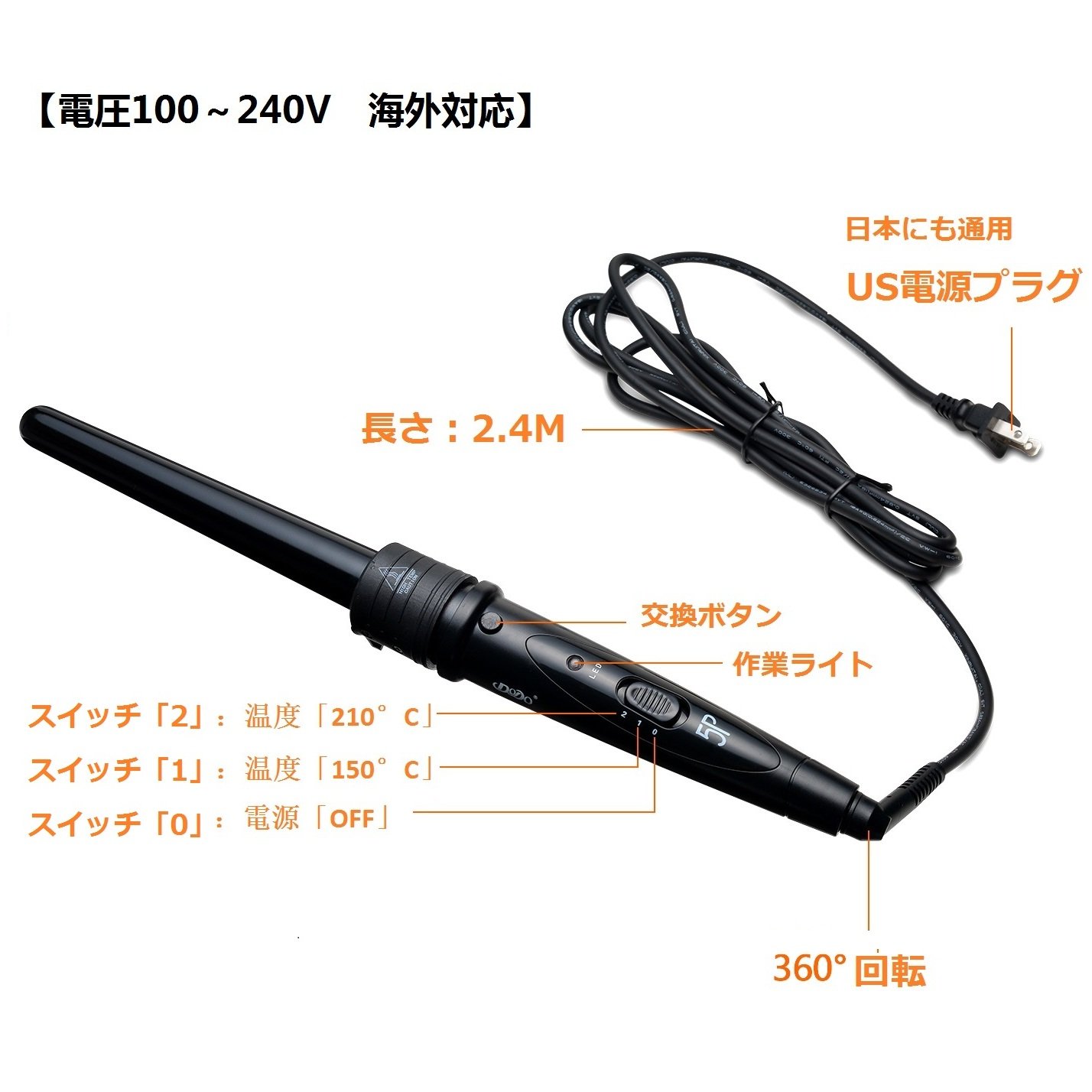 360 ° rotation · 2.5 m long power cord