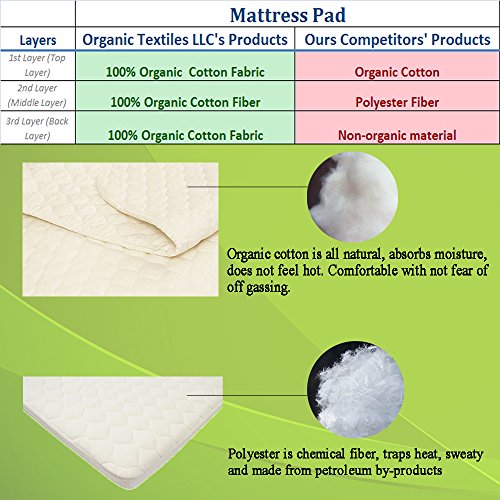 -. Brand : OrganicTextiles -. Feature : All organic cotton mattress pads made from finest certified organic cottons filling and organic cotton soft covering. No dyes or chemicals, minimal processing to keep it close to nature. / Very refreshing and do not have the limitation of spot cleaning or dry cleaning as most other mattress pads do. Can be washed as needed. / Heavy duty. Made to last and have 25-50% higher filling than most mattress pads in the market. This will protect your mattress investment for long time. / Pads are designed to stay in place without straps or elastic bands. This increases the life span of the pad and mattress. / Great for users who like dry surface without the "polyester feel". Easily absorbs sweat of accidental spills. Helps individuals with hot flashes. -. Label : OrganicTextiles LLC -. Manufacturer : OrganicTextiles LLC -. PackageQuantity : 1 -. ProductGroup : Home -. ProductTypeName : HOME_BED_AND_BATH -. Publisher : OrganicTextiles LLC -. Studio : OrganicTextiles LLC -. Title : Organic Cotton Mattress Pad With Organic Filling