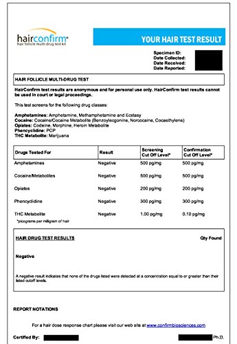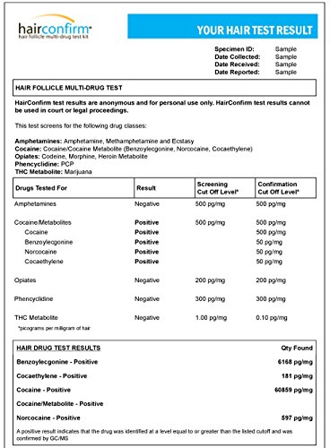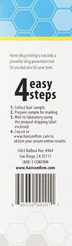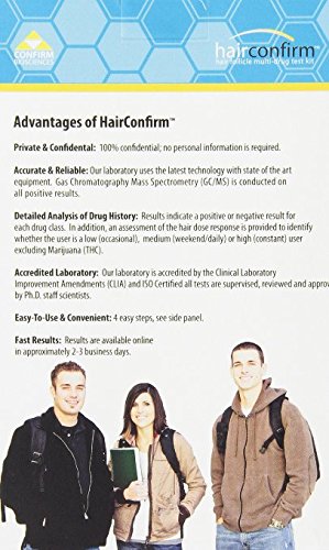 ReleaseDate : 2007-07-24 Studio : HairConfirm Publisher : HairConfirm Binding : Health and Beauty Product Description HairConfirm is the ideal drug testing solution for parents, employers and individuals in need of a fast and accurate hair drug test that is easy to perform and is cheat proof. This kit tests drug usage by analyzing a hair sample, which allows for a full 90 day drug history report that includes the drug user type and quantities present in hair. Results are available within 2 business days upon receipt of the sample by the lab, and are 100 percent secure and confidential.