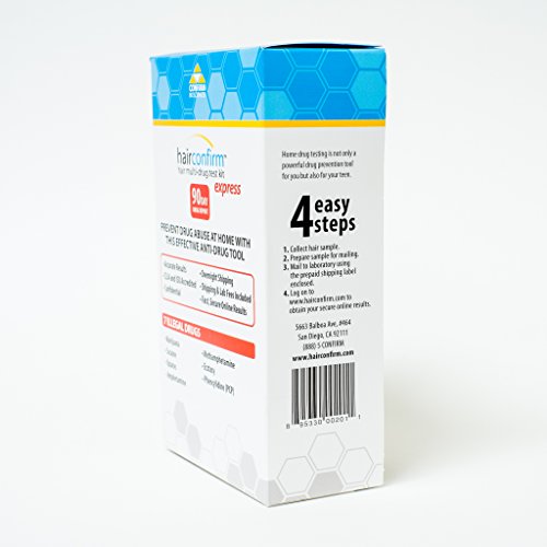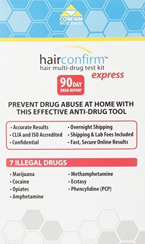 The HairConfirm Express drug test kit includes overnight shipping to ensure quick results within days of mailing the sample. This kit screens for a 90-day drug use history of Marijuana (THC), Cocaine (COC), Opiates (OPI), Amphetamine (AMP), Methamphetamine (mAMP), Ecstasy (MDMA) and Phencyclidine (PCP). 0