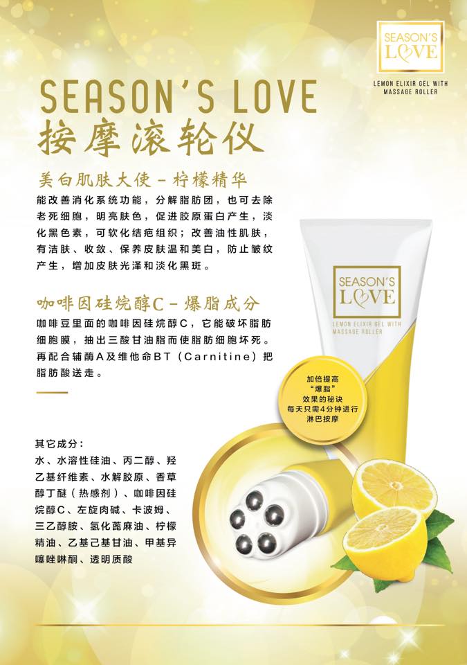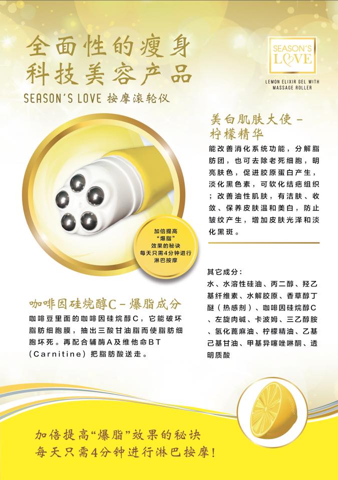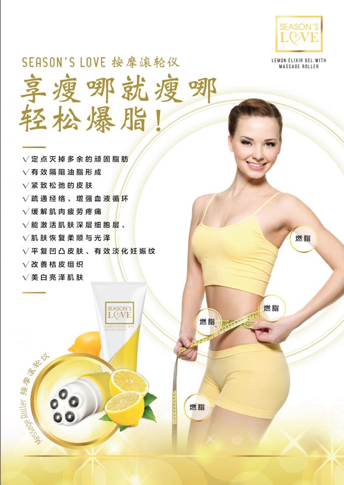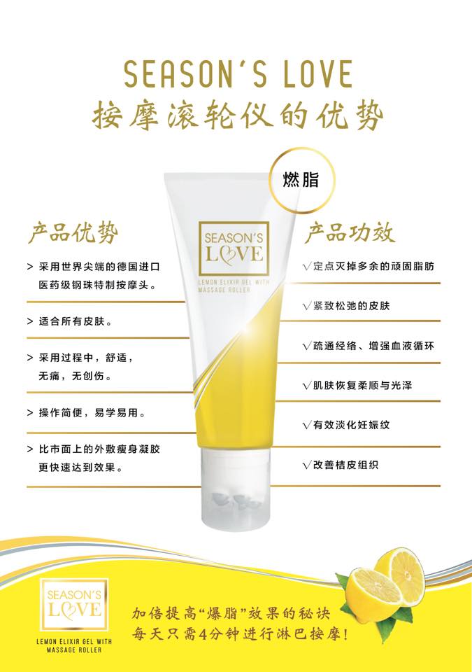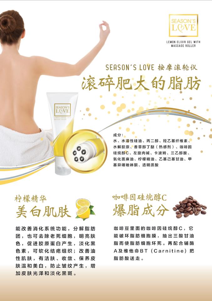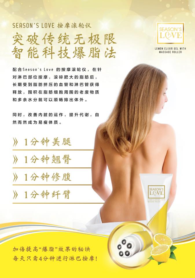 配合Season’s Love 的按摩滚轮仪,在针对淋巴部位按摩,滚碎肥大的脂肪后,长期受到脂肪挤压的血管和淋巴管获得释放,囤积在脂肪细胞周围的老废物质和多余水分就可以顺畅排出体外。同时,需要的营养和氧气也能顺利输送到各细胞,改善内脏的运作,提升代谢,自然而然成为易瘦体质。