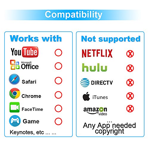 Note: 1.Not Compatible with the app that requires copyright, like: Netflix/ iTunes/ Amazon Video/ HBO go/ Hulu Plus/ Honda Motor/ ESPN