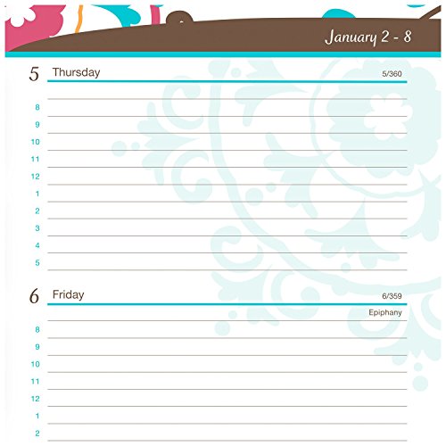 -. Feature : Suzani Premium Desk Weekly / Monthly Appointment Book helps you balance work and home life all year long and cover 13 months, from January through January / One week per two page spreads are ruled with hourly appointments from 8:00 a.m. - 5:00 p.m. Monday - Friday to keep work days on schedule. Saturday and Sunday are condensed and un-timed. / One month per page format include large ruled daily blocks to keep scheduling clear and organized and notes space for jotting down quick notes, reminders and to-do's. Past and future months reference calendar for quick and easy date checking. / Special pages include holiday list, 3-year reference calendar, event calendar, contacts and notes pages to keep all of your important information in one convenient location / P.R.Inted on quality paper that contains 30% post-consumer material with a quality wire binding and wrap around suede-feel cover. Page size is 4.88 in. x 8 in. and the overall size is 6.31 in. x 8.88 in. x .5 in. Available in Teal.