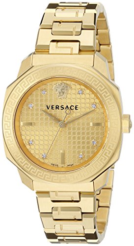 -. Binding : Watch -. Brand : -. Department : womens -. EAN : 7630030504518 -. Feature : Round watch with Greca-pattern bezel featuring diamond indices and Medusa logo at 12 o'clock / 35 mm gold ion-plated stainless steel case with anti-reflective sapphire dial window / Swiss quartz movement with analog display / Gold ion-plated stainless band and deployant clasp with push-button closure / Water resistant to 50 m (165 ft): In general, suitable for short periods of recreational swimming, but not diving or snorkeling -. Label : First SBF Holding Inc. -. Manufacturer : First SBF Holding Inc. -. Model : VQD060015 -. MPN : VQD060015 -. PartNumber : VQD060015 -. ProductGroup : Watch -. ProductTypeName : WATCH -. Publisher : First SBF Holding Inc. -. Studio : First SBF Holding Inc. -. Title : Women's VQD060015 Dylos Analog Display Swiss Quartz Gold-Plated Watch