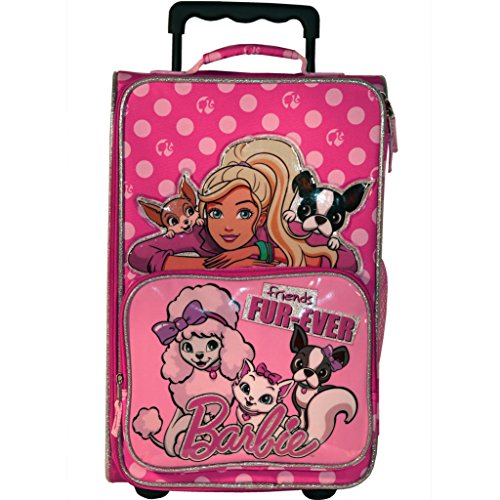 Product Description Barbie Rolling Luggage measures 18-inch height x 11.5-inch width x 7.75-inch depth. Sublimation print on nylon twill fabric. Heat sealed foam backed patches with Barbie and Pet Friends. Trim is silver glitter PVC piping. Outside front zip pocket and 2 inside Mesh Pockets. 0