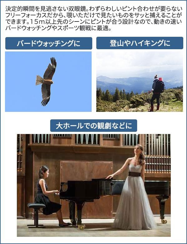| 決定的瞬間を見逃さない双眼鏡。初心者でも簡単に使えるフリーフォーカス!!わずらわしいピント合わせが要らないので、覗いただけで見たいものをサッと捕えることができます!!15m以上先のシーンにピントが合う設計なので、動きの速いバードウォッチングやスポーツ観戦に最適です。 |