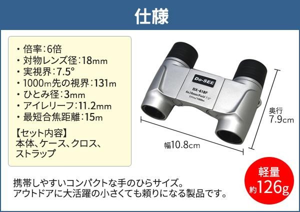 | 仕様 | 倍率:6倍 対物レンズ径:18mm 実視界:7.5度 1000m先の視界:131m ひとみ径:3mm アイレリーフ:11.2mm 最短合焦距離:15m |