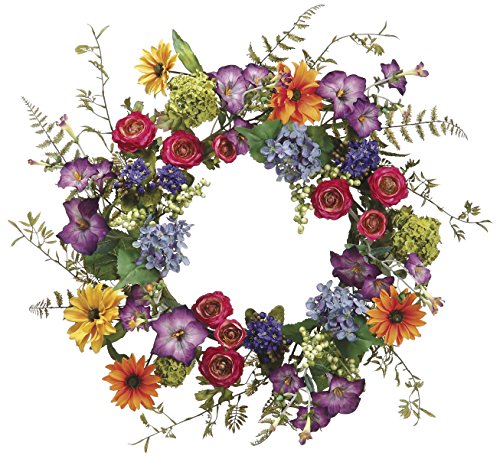 - 24 inch Spring floral wreath with artificial daisies, ranunculus, ferns, berries and morning glory