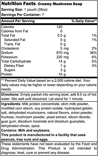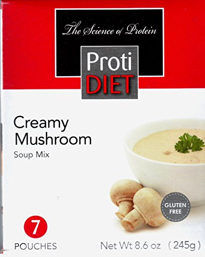 -. Binding : Health and Beauty -. Brand : Protidiet -. Feature : high protein soup / 120calories in each serving / delicious low carb soup / contains 14 grams of carbs / Contains milk and soybeans. This product is manufactured in a facility that uses peanuts, tree nuts and eggs. -. IsAdultProduct : 0 -. Label : Pro-Amino -. LegalDisclaimer : These statements have not been evaluated by the Food and Drug Administration. This product is not intended to diagnose, treat, cure, or prevent any disease. -. Manufacturer : Pro-Amino -. MPN : PTD61 -. PackageQuantity : 1 -. PartNumber : PTD61 -. ProductGroup : Health and Beauty -. ProductTypeName : HEALTH_PERSONAL_CARE -. Publisher : Pro-Amino -. Studio : Pro-Amino -. Title : ProtiDiet High Protein Creamy Mushroom Soup