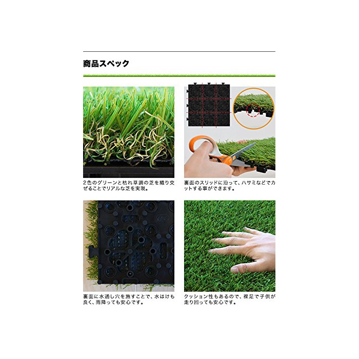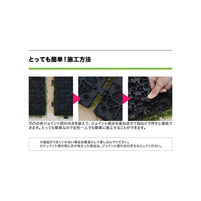 시공 방법에 대해서:시공 방법은 인조 잔디를 까는 것 뿐(만,만큼)이지만,인조 잔디를 고정하는 것으로(에) U자 핀이나 인조 잔디용 양면 테이프 접착제 등을 사용하는 것을 추천합니다.제품에는 이러한 시공 재료는 부속 하고 있지 않으므로 주의하여 주십시오.