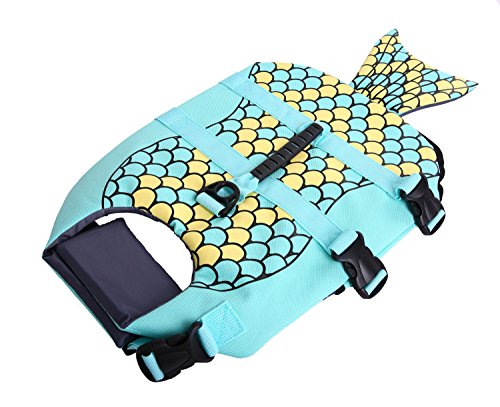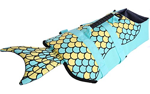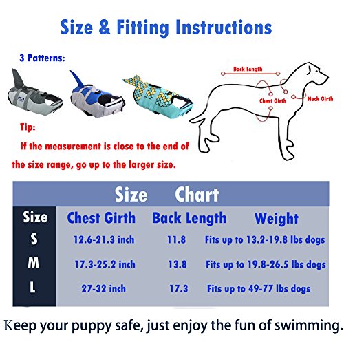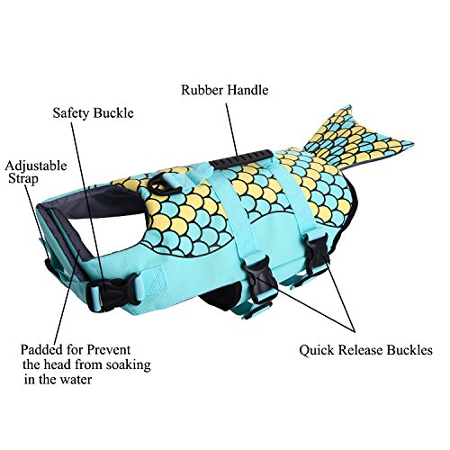 -. Feature : ❤❤IN CASE OF EMERGENCY, SAFE❤❤ When it comes to water, there is no such thing as being "too safe." That's why the QBLEEV life jacket is constructed with rubber grab handles making it easy for you to pull your dog out of any emergency. Belly buckles and chest straps keep the jacket secure on your dog while they are in the water.Built with extra padding to enable strong buoyance and safety guarantee. / ❤❤FIT & FUNCTION❤❤Dogs come in all shapes and sizes. Whether your dog is short and stout or long and lanky, there's a Dawson life jacket that's perfect for them. QBLEEV life jackets are available in sizes ranging from S to L, making it easy for you to choose a size that supports your dog and fits their swimming needs. Please kindly read the HOW TO MEASURE & SIZE CHART illustration and SIZE TABLE in the product pictures to get a right size for your beloved dog / ❤❤CONVENIENCE, QUICK-RELEASE❤❤ Adjustable belt and quick-release buckles to make your dog fit comfortably, easy to put on and take off. Handle on top for quick and easy grabbing. The Heavy-duty D-ring Hook is perfect for dog leash.Convenient top grab handle for easy rescues by hand or boat hook. / ❤❤UNIQUE MERMAID AND SHARK STYLE❤❤We have 3 types of life jackets, 2 in shark style,on in mermaid style. Surely make your pet become the star while swimming ,walking and other water based activities,the fish scales will catch eyes.PERFECT FOR POOL PARTIES, TRIPS to the beach or on the boat. / ❤❤OUR COMMITMENT FOR SAFETY❤❤ If your measurement is between two sizes, we recommend the larger size for more comfortable fit about your dog. If you have any problems or confusions after receiving the product, pls let us know, we will be glad to solve it, GIVE YOUR MONEY BACK OR REPLACEMENT.