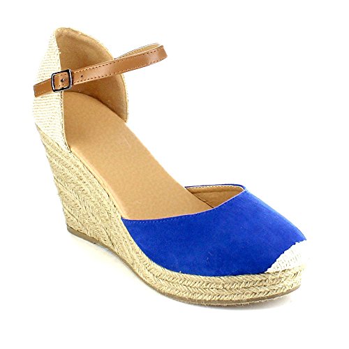 It runs half a size bigger.. Featuring faux suede/fabric upper, cap toe detail, adjustable ankle straps with buckle closure, stitching detail, jute rope platform wedge heel, and finished with padded footbed for comfort.