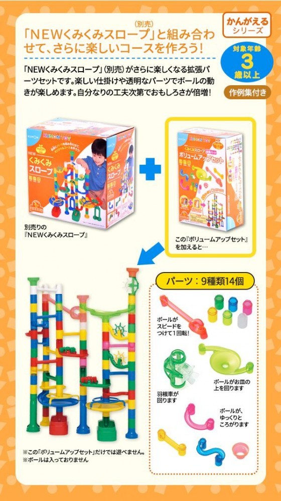 | 「NEWくみくみスロープ」(別売)がさらに楽しくなる拡張パーツセットです。楽しい仕掛けや透明なパーツでボールの動きが楽しめます。自分なりの工夫次第でおもしろさが倍増! |