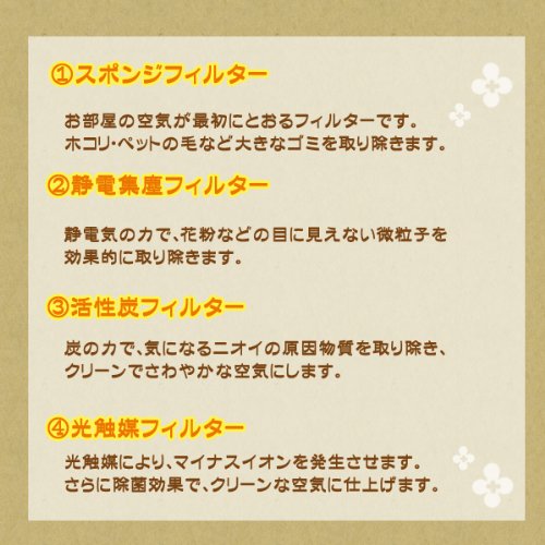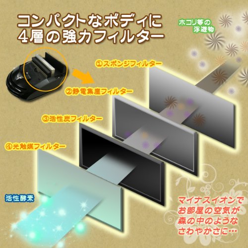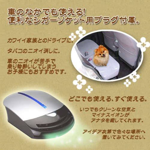 -. Feature : コンパクトなボディに4層の強力フィルター! / マイナスイオンを発生させ、さらに除菌効果でクリーンな空気に仕上げます。 / 車の中でも使える便利なシガーソケット用プラグ付属。 / [サイズ]タテ193×ヨコ121×高さ53mm [重量]300g / [入力電源]DC12/4W