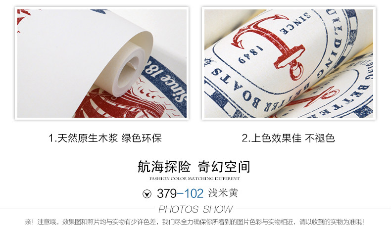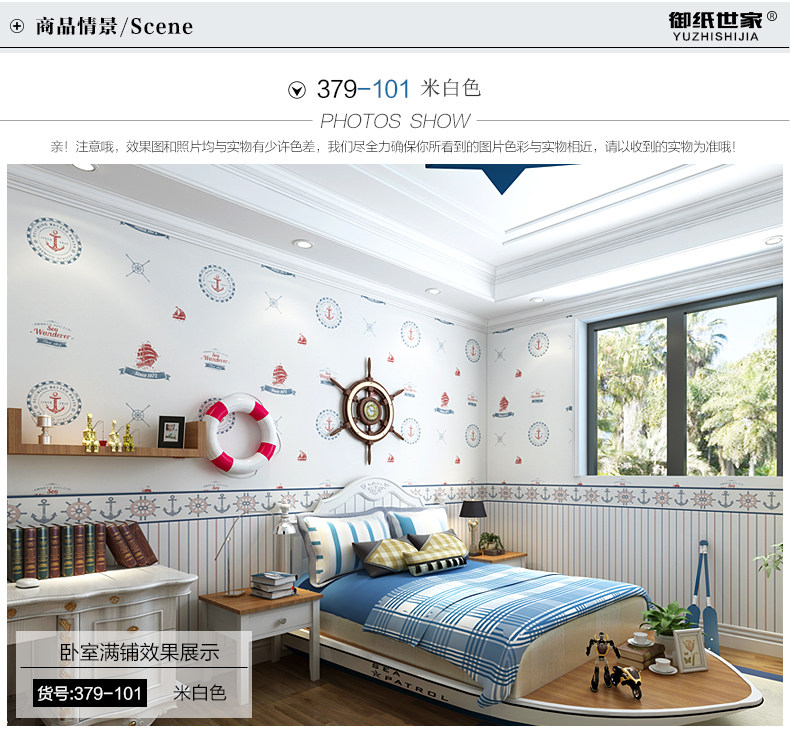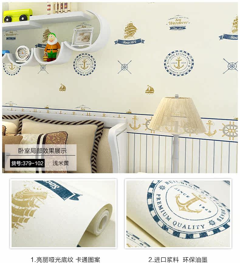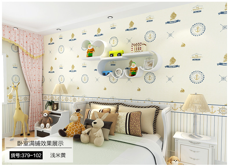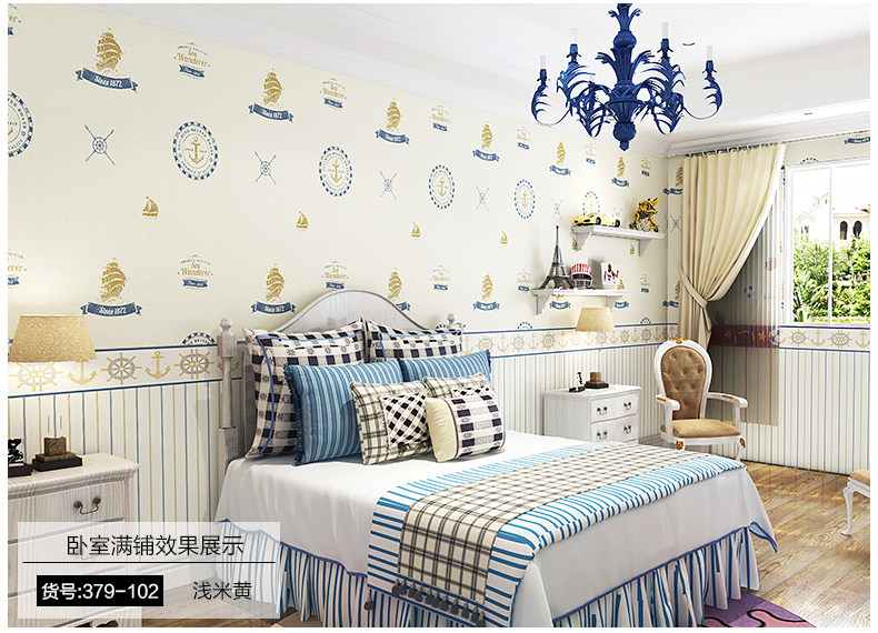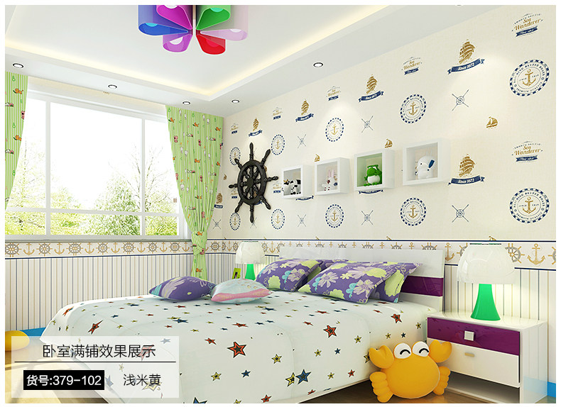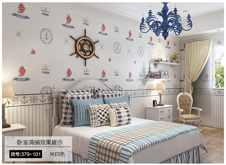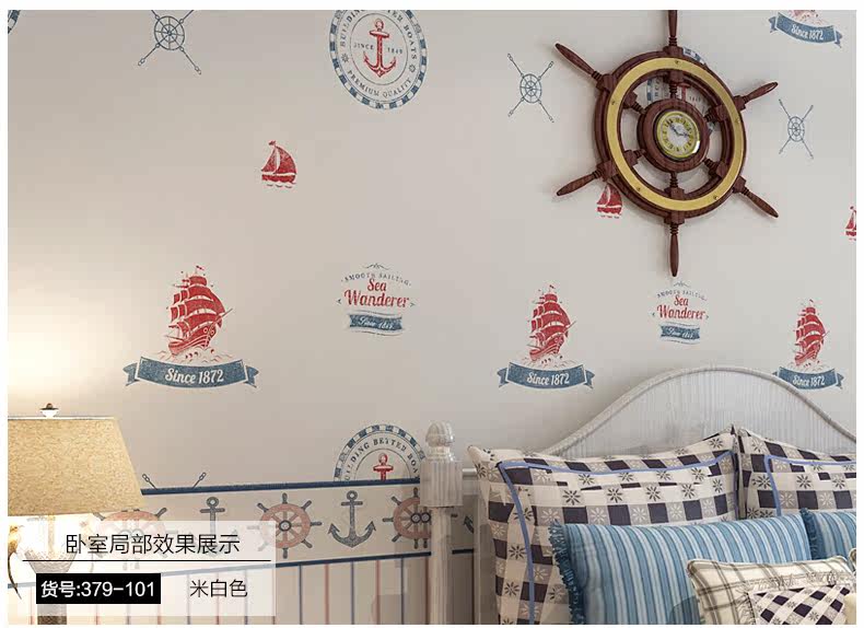 御纸世家 儿童房壁纸 卡通地中海帆船男孩卧室ab版竖条纹纯纸墙纸