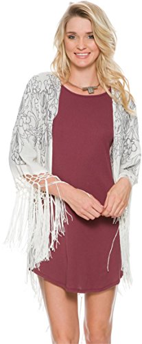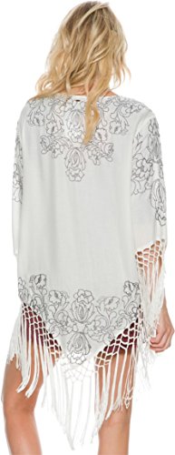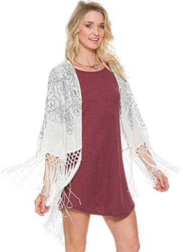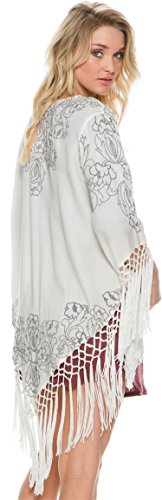 An embellished woven kimono with embroidery featured throughout. Open front design. Half-length sleeves with fringe detail for dramatic flair. Brand logo at nape. Droptail, fringed hemline. 100% viscose. Machine wash cold, tumble dry low. Imported.