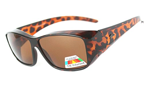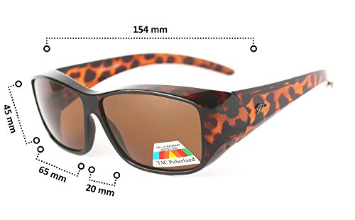 • QUALITY DESIGNER LOOK: Look stylish in these all plastic frames and lenses glasses that are designed for men or women with a trendy look; the imported GREAT PICK FIT OVER GLASSES SUNGLASSES are polarized so will keep out glare and block one hundred percent of UV rays from your eyes; the two arms that go over the ears have slip guards on each; see Description below for exact measurement of the lenses to make sure they fit over your regular to large prescription glasses;