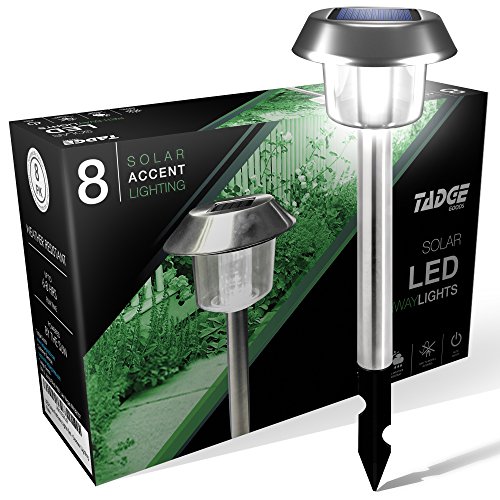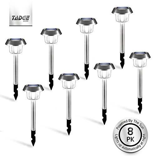 - 8 PACK BEST VALUE – Get more for less with the Tadge Goods solar outdoor pathway lights. Your landscape yard lighting set will come with 8 super bright high powered, 15 lumen led, ready to use path lights in a gorgeous colored box packaged to perfection.