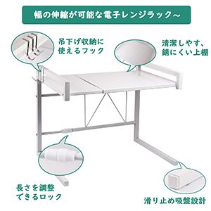- 幅の伸縮により、電子レンジのサイズや消防法、メーカーが定めた加熱空間の確保に対応。