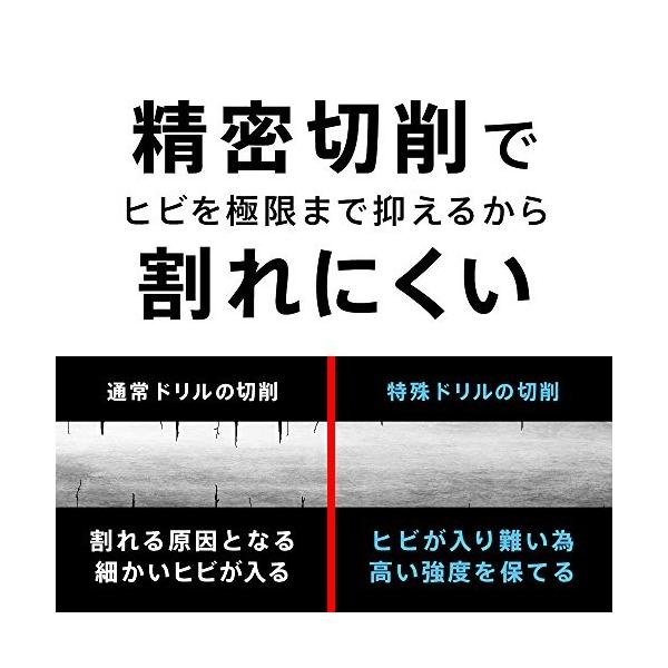 | 商品の説明 | 新製法の切削技術で細かなヒビを極力抑え、曲げた際にひび割れが広がらず破損しにくくなっております。 日本製の特殊素材でガラスを強化することにより衝撃を分散させ、吸収します。 耐衝撃性は通常ガラスの約5倍です。 約35,000回の摩擦試験をクリアした超耐久コート 長期間コーティングが維持できるのでガラス表面を綺麗・清潔に使用できます。 約400度の高温処理で6時間かけ硬度を上げており、電動ドリルを当てたとしても傷が付きにくいです。 |